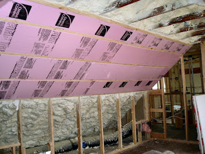 In the rest of the space, we mounted the rigid insulation between ledgers attached to the rafters, so the cold spots of the wood are reduced only to very small squares where the two planks of wood meet: